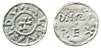 However, when Edward's army approached and camped at Badbury Rings, an Iron Age hill fort four miles west of Wimborne, Æthelwold was unable to gain sufficient support to meet them in battle. Leaving behind his consort, he fled to the Danes of Northumbria, who accepted him as king.[40] Northumbrian coins were issued at this time in the name of a king called 'Alwaldus', who is thought to have been Æthelwold.[41][j] Norse sagas record traditions of a Danish king Knútr, who briefly ruled Northumbria around 900. He is said to have been at first repulsed by an English king called Adalbrigt north of Cleveland, but then to have defeated him at Scarborough. In 1987, Smyth suggested that Adalbrigt could have been Æthelwold,[43] but in 1995 Smyth put forward the alternative idea that the Northumbrian Danes accepted Æthelwold's claim to be king of the West Saxons rather than taking him as their own king.[44]