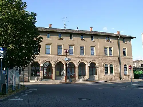 Öhringen Hauptbahnhof is a station on the Hohenlohe Railway in Öhringen in the German state of Baden-Württemberg. The station is classified by Deutsche Bahn as a category 5 station.[1] The station is part of the zone of the KreisVerkehr Schwäbisch Hall (transport district of Schwäbisch Hall) and is the largest and most important station of the Hohenlohe district.