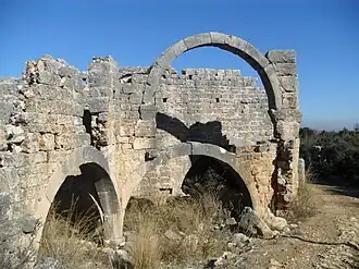 The house ruins in the north of the site are examples of the polygonal and Byzantine masonry. One house is a peristyle house. The foundations of some buildings are carved rock. There are sarcophagi along the road. At the center of the site there are ruins of a basilica. The basilica with three naves and a transept is backdated to about 500. There is a smaller church situated about 500 metres (1,600 ft) south of the basilica.[2]