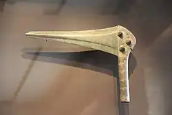 A gold axe and jewellery dating from c. 1800 BC were discovered at Dieskau in Germany and are thought to be associated with the ruler buried in the Bornhöck mound.[41] A gold dagger dating from the Early Bronze Age has also been recovered from Inowrocław in Poland, associated with the Iwno culture.[42][41] Gold weapons are known from other parts of Europe in this period, including a gold axe from Tufalau in Romania belonging to the Wietenberg culture,[43] a gold dagger from Mala Gruda in Montenegro belonging to the Vučedol culture,[44] a gold dagger from Dabene in Bulgaria, and gold daggers and halberds from Perșinari and Măcin in Romania belonging to the Tei culture.[45] The Tei culture weapons were found buried with gold bracelets of Únětice type.[46]