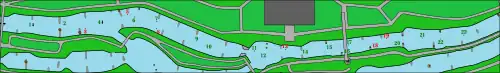 The centre has two parallel whitewater channels; the drop is the same for both channels, 6.6 meters (22 feet). The left channel is 356 meters long, with a 1.9% slope of 19 m/km (98 ft/mile) and a streamflow of 7 to 22 m3/s (247 to 777 ft3/s). The right channel is 460 meters long, with a 1.4% slope of 14 m/km (76 ft/mile) and a streamflow of 7 to 12 m3/s (247 to 424 ft3/s). When both channels are watered, the left channel streamflow is 15 m3/s (530 ft3/s) and the right is 7 m3/s (247 ft3/s).[1]