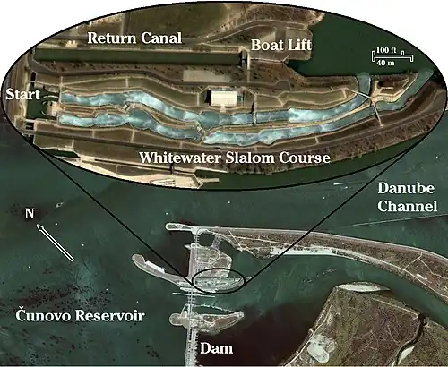 The Čunovo Water Sports Centre is an artificial whitewater slalom course in Slovakia, on an island in the Danube river, 14 km southeast of Bratislava, near the village of Čunovo. It is powered by flow diversion from the Čunovo dam. Since 1997, it has hosted a full schedule of local, regional, and international competitions, including multiple World Cup races, 2 European Championships and the 2011 World Championships.