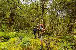 There were never any sawmills in the valley.[14] Forest covers the whole valley, with no grassy flats. Tall forest is replaced by stunted forest, merging to alpine scrub, at 800 m (2,600 ft) to 1,200 m (3,900 ft), depending on aspect, landform and cold air drainage. The valley has an average of over 2,540 mm (100 in) of rain, more than 200 wet days a year[13] and rainfall has been measured at over 5 cm (2.0 in) per hour.[15] In the 1970s red deer, goats and rats were scarce, possums in moderate numbers and stoats everywhere. The valley now has pest control as part of the Paparoa Range TB Management Area.[16]