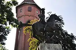 Jan Henryk Dąbrowski monument with a historic water tower in the background
