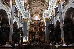 The monumental altar was made between 1712 and 1714. The object, composed of three main parts or storeys, is adorned by the gilded figures of saints and martyrs. John III Sobieski gifted a painting to the Jesuits after his victory at the Battle of Vienna and it was later incorporated into the altarpiece.[13]