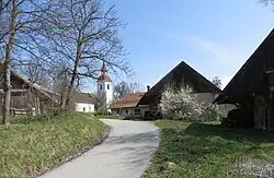 The local church is dedicated to the Assumption of Mary and belongs to the Parish of Škocjan pri Turjaku. In its core it is a 15th-century Gothic building that was restyled in the Baroque in the mid-18th and 19th centuries.[4]