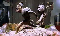 Most of the devils are sculptures in wood, ceramic, stone, or paper. Others are masks or paintings on silk or canvas. The devils, collected from all over the world, are diverse in style. Many of the devils are art objects, for display only, but other devils have been incorporated into usable objects such as pipes and nutcrackers.[1] Many of the items represent folk myths and others express modern political ideas. For example, one sculpture depicts Hitler and Stalin as devils in a dance of death over a pile of human bones.[1][3]