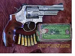 Smith & Wesson wished to pair their new revolver design with a worthy new ammunition chambering.[5] At the time, smokeless powder was state of the art in ammunition technology. Older black-powder ammunition was in the process of being converted to smokeless. Smith & Wesson's popular .44 Russian cartridge had established a reputation for superb accuracy and was a renowned target load, and they decided to use an improved smokeless powder version as the basis for the new round. Due to the lower energy density of the early semi-smokeless powders, prior efforts to convert the .44 Russian to smokeless had produced less than stellar ballistic performance. Smith & Wesson addressed this issue by lengthening the .44 Russian cartridge case by 0.190-inch (4.8 mm) and increasing the powder capacity by 6 grains (0.39 g).[6] The resulting design, which S&W called the .44 Special, had a case length of 1.16-inch (29 mm).[5]
