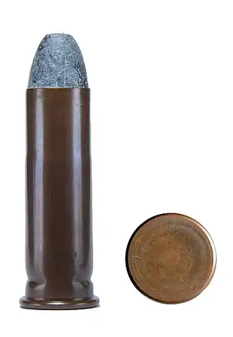 ![]() .50-70 Government cartridge, note the hidden centrefire primer is held at the base internally by the cartridge crimps. | ||||||||||||||||