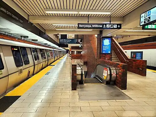 The station has three underground levels. The first level is a concourse with ticket machines and faregates. An island platform and two main tracks (C1 and CX) for northbound trains (bound for Richmond and Antioch) are on the second level. A side platform with one track (C2) for southbound trains (bound for Berryessa or San Francisco) is on the third level.[4][5] The station has red brickwork, contrasting with the blue of nearby 19th Street Oakland station.[6]