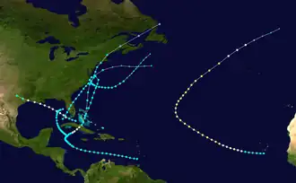 The first hurricane of the season was observed near Cape Verde, beginning at 0600 UTC on August 31. Initially a tropical storm, it slowly strengthened while heading west-northwestward, reaching hurricane status on September 1. Curving northwestward, the storm intensified further into a Category 2 hurricane on September 3. It continued heading northwestward until curving to the northeast late on September 6. Around 1130 UTC on the following day, the storm attained its peak intensity with maximum sustained winds of 100 mph (155 km/h) and a minimum barometric pressure of 972 mbar (28.7 inHg). Early on September 9, the system weakened to a Category 1, before transitioning into an extratropical cyclone well north of the Azores later that day. The extratropical remnants continued weaken, before dissipating west of Ireland on September 10.[2] The crew of the barkentine St. Peter reported that another ship capsized with 45 men aboard; all of them drowned.[3][4]