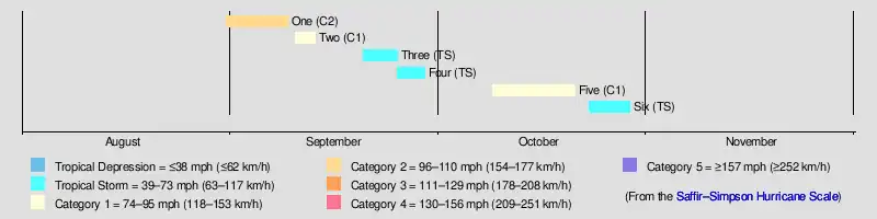 The 1897 Atlantic hurricane season was an inactive season, featuring only six known tropical cyclones, four of which made landfall. There were three hurricanes, none of which strengthened into major hurricanes, which are Category 3 or higher on the modern-day Saffir–Simpson hurricane wind scale.[1] The first system was initially observed south of Cape Verde on August 31, an unusually late date. The storm was the strongest of the season, peaking as a Category 2 hurricane with winds of 100 mph (155 km/h). While located well north of the Azores, rough seas by the storm sunk a ship, killing all 45 crewmen. A second storm was first spotted in the Straits of Florida on September 10. It strengthened into a hurricane and tracked northwestward across the Gulf of Mexico, striking Louisiana shortly before dissipating on September 13. This storm caused 29 deaths and $150,000 (1897 USD) in damage.