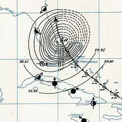 The hurricane weakened slightly while moving west-northward across the Caribbean Sea and made landfall in Guayama, Puerto Rico late on August 8 with winds of 140 mph (220 km/h).[1] August 8 was the namesday of Saint Cyriacus, hence the hurricane's nickname.[4] Several weather stations across the island reported low barometric pressures, with a reading as low as 939 mbar (27.7 inHg) in Guayama. Wind shifts were also experienced across the island, primarily in the south and the west. The storm crossed Puerto Rico in approximately six hours and emerged into the Atlantic Ocean late on August 8, while weakening to a Category 3 hurricane, with winds decreasing to 120 mph (195 km/h). The hurricane would maintain this intensity for more than nine days. Continuing west-northward, the hurricane brushed the north coast of Dominican Republic on August 9. Thereafter, the system moved slowly northwestward through the Bahamas, striking Inagua on August 10 and Andros Island on August 12.[1] According to telephone and telegraph reports from the Weather Bureau, the storm was predicted to make landfall in Florida.[2]