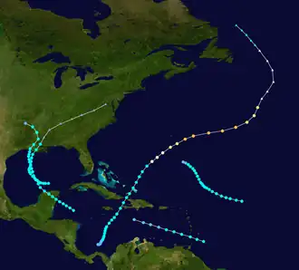 Of the season's five tropical cyclones, only one reached hurricane status, the fewest since 1890. Furthermore, that storm strengthened into a major hurricane, which is Category 3 or higher on the modern-day Saffir–Simpson hurricane wind scale.[1] This storm, which was the fourth and strongest hurricane of the season, peaked at Category 3 strength with 120 mph (195 km/h) winds. It was also attributed to at least six fatalities after sending a rogue wave across the steerage of the steamer Campania. The first storm also resulted in two deaths after a schooner wrecked in Barbados.