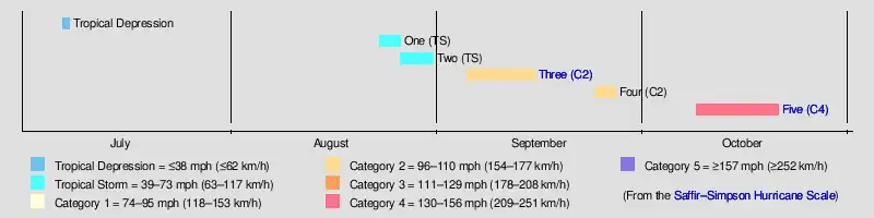 2. ^ This damage figure is derived from the sum of damage of estimates at two locations affected by Hurricane Five, and is likely not representative of the season's total damage.