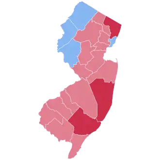 On the county-level map, reflecting his comfortable victory, Hughes carried 17 of the state's 21 counties, breaking sixty percent of the vote in three. Wilson's only significant win was urban Hudson County, while he also won the three rural counties in western North Jersey, Warren, Sussex, and Hunterdon, which had long been non-Yankee Democratic enclaves in the otherwise Republican Northeast.[2] Warren and Hunterdon had never voted Republican as of 1916 – and Sussex only for William McKinley in 1896 – yet Wilson would prove the last Democrat to win Sussex County until Lyndon Johnson in 1964.[3]
