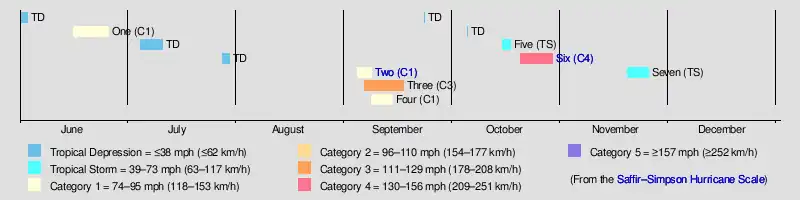 In addition to the seven tropical storms, five other systems formed but failed to reach tropical storm intensity. The first such cyclone developed over the northwestern Caribbean on June 1. Moving quickly northeastward, the depression crossed Cuba and the Bahamas before reaching the western Atlantic. The depression became extratropical by June 3.[3] On July 5, a tropical depression formed in the northeastern Gulf of Mexico. Tracking to the west, the depression degenerated into a trough while offshore Louisiana on July 8. That day, 5-minute sustained wind speeds of 39 and 40 mph (63 and 64 km/h) were observed in Galveston and Corpus Christi in Texas, respectively. The depression regained a closed circulation by July 10, shortly before making landfall near Galveston. By July 11, the system dissipated over northern Texas.[4]