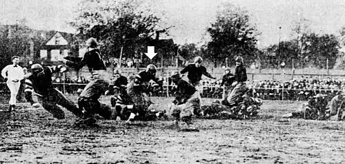 The extreme limitations of Normal Park as a football venue are evident in this photograph of Cards back Paddy Driscoll (arrow) carrying the ball through the Buffalo All-Americans' line, September 30. Although virtually indistinguishable here, the Cardinals wore bright red-and-white jerseys, the All-Americans, black-and-orange.