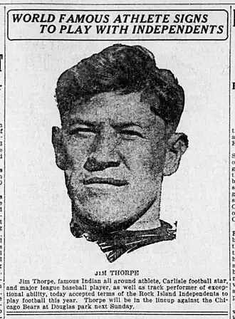 4. ^ a b "Independents Sign Jim Thorpe: Famous Indian Grid Star Reports for Practice at Douglas Park Wednesday," Davenport Daily Times, Sept. 22, 1924, p. 14.