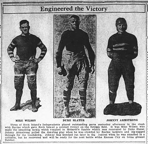 13. ^ Art Williams, "Independents Slip Over Win at Racine, 6–3: Armstrong in Great Dash to Score After Slater Gets Fumble," Rock Island Argus, Nov. 10, 1924, p. 12.