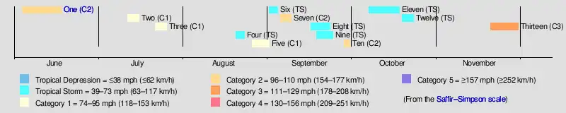 The 1934 Atlantic hurricane season produced thirteen tropical storms, of which seven further organized into hurricanes. Of those seven hurricanes, only one intensified into a major hurricane, which is a Category 3 or stronger system on the modern-day Saffir–Simpson scale. The first system developed on June 4 while the last storm dissipated on November 30. In 2012, as part of the Atlantic hurricane reanalysis project, meteorologists identified two previously unknown September tropical storms and fine-tuned the meteorological histories of many others. However, given scant observations from ships and weather stations, significant uncertainty of tropical cyclone tracks, intensity, and duration remains, particularly for those storms that stayed at sea.[1]
