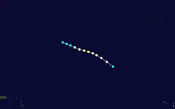 A tropical storm was first documented east of Barbados around 12:00 UTC on September 16. It alternated between a west-northwest and west motion for several days, narrowly missing the Leeward Islands and gradually strengthening to a peak intensity of 50 mph (80 km/h). The system weakened to a tropical depression on September 21 and passed near the northern Bahamas before turning north and north-northeast. It dissipated after 12:00 UTC on September 23 off southeastern North Carolina while interacting with an approaching front.[5][6] The Lesser Antilles mainly recorded rainfall due to the storm, with Martinique observing up to 1.5 in (38 mm) at Ducos.[48]
