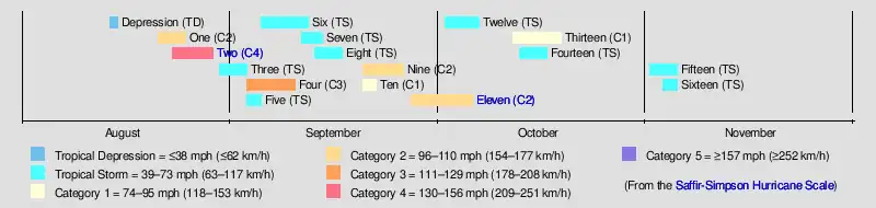 The 1949 Atlantic hurricane season was the last season that tropical cyclones were not publicly labeled by the United States Weather Bureau.[1] It officially began on June 15, and lasted until November 15. These dates conventionally delimit the period of each year when most tropical cyclones form in the Atlantic basin. The first storm, a tropical depression, developed in the northern Gulf of Mexico on August 14. The final system, Tropical Storm Sixteen, dissipated in the southwestern Caribbean Sea on November 5. It was a fairly active season, featuring 16 tropical storms and seven hurricanes. Two of these strengthened into major hurricanes, which are Category 3 or higher on the Saffir–Simpson hurricane wind scale.[2]