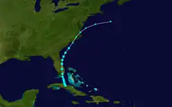 A low-pressure area formed along a dissipating cold front to the north of Puerto Rico. The system moved westward, developing some tropical characteristics by October 13.[5] The next day, the system became a tropical storm over the Straits of Florida.[9] On October 15, it crossed over South Florida near Homestead with winds of 60 mph (95 km/h).[5] While it is unclear whether this cyclone ever became fully tropical, it is entered into HURDAT as a tropical cyclone.[3] The storm intensified further over the Florida peninsula, peaking at 65 mph (105 km/h) early on October 16.[9] After affecting Florida, the storm crossed the western Atlantic and moved across the Outer Banks.[5] The storm became extratropical on October 17, and the next day it was absorbed by another extratropical storm.[19]