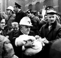 Leading Ambulanceman Bob Scott removes the body of the youngest victim, Colin Nicholl, from under the rubble