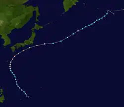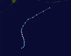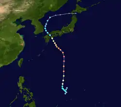 Typhoon Tess was first noted as a closed circulation on 1 September 600 nautical miles east-northeast of Saipan. The storm intensified over the next few days, becoming a typhoon on the 3rd. The cyclone reached its peak intensity on the 4th. Tess then weakened, losing typhoon status on the 8th, and dissipating over the Sea of Irkutsk on the 10th, being absorbed into a frontal system.[3]
