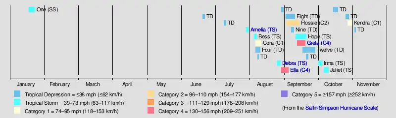 Tropical cyclogenesis began very early, with the development of a subtropical storm on January 18. It dissipated about five days later. However, the next tropical cyclone, an unnumbered depression, did not develop until June 21. In July, there were two systems, including an unnumbered tropical depression and Tropical Storm Amelia. Seven tropical cyclones formed in August, including Tropical Depression Four, tropical storms Bess and Debra and hurricanes Cora and Ella. There were also seven systems in September – tropical depressions Eight, Nine, and Twelve, Tropical Storm Hope, and hurricanes Flossie and Greta. During the month of October, there were five tropical cyclones, with two unnumbered tropical depressions, tropical storms Irma and Juliet, and Hurricane Kendra. There was another unnumbered tropical depression in November, which dissipated on November 5.[4]
