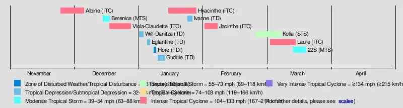 Laure existed from 8 March to 17 March. On March 13, the cyclone passed just east of Mauritius, producing wind gusts of 109 km/h (68 mph) and 65.7 mm (2.59 in) of rainfall.[12]