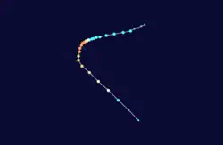 The system that was to become Tropical Cyclone Joti was first noted by the Central Pacific Hurricane Center (CPHC) during October 30, while it was located about 1000 km (620 mi) to the north-east of Port Villa in Vanuatu.[8][9] Over the next day, the disturbance gradually developed further, as its outflow increased and atmospheric convection surrounding the system organized.[8] The disturbance was subsequently named Joti at 00:00 UTC on November 1, by the FMS as it had developed into a tropical cyclone.[8] As a result, this made Joti one of the earliest tropical cyclones ever recorded within the basin.[8] After it was named, Joti continued to develop as it completed a cyclonic loop, before it started to move south-westwards towards Vanuatu during November 2.[8][9]
