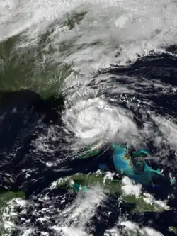 The origins of Tropical Storm Edouard are unclear, but an area of persistent organized storms formed in the Bay of Campeche, which strengthened into a tropical storm on September 14. Edouard rapidly intensified, with wind speeds reaching 65 miles per hour (105 km/h) in 18 hours as a faint eye feature became visible. Following its strengthening, Edouard dissipated even more quickly, degenerating into an area of thunderstorms the next day.[36] The remnants of Edouard moved over land near the port of Veracruz.[37]