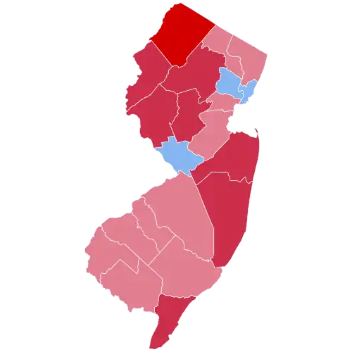 Bush carried New Jersey with 56.24% of the vote, while Dukakis received 42.60% a 13.64% margin of victory.[2] New Jersey weighed in for this election as almost 6% points more Republican than the national average. Bush won 18 of New Jersey's 21 counties, with Dukakis only winning the heavily Democratic counties of Mercer, Essex, and Hudson.
