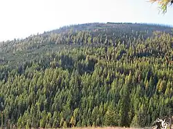 Directly off of Highway 20 are two points of interest and associated overlooks. At the crest of the 5,575 ft (1.699 km) Sherman Pass, in the shoulder between Sherman Peak and Columbia Mountain is Sherman Pass overlook. A paved 0.25 mi (0.40 km) loop trail passes by the overlook which has interpretive signage about the vista east towards Paradise Peak, Graves Mountain, and the various fire-formed landscapes in the Upper Sherman Creek Valley.[17] West of the pass is the White Mountain Interpretive Site which was built after the 1988 fire. The site includes interpretive signage about the effects of the fire on the western slopes of the Kettle River Range and has a fully paved 0.25 mi (0.40 km) trail.[18][19]