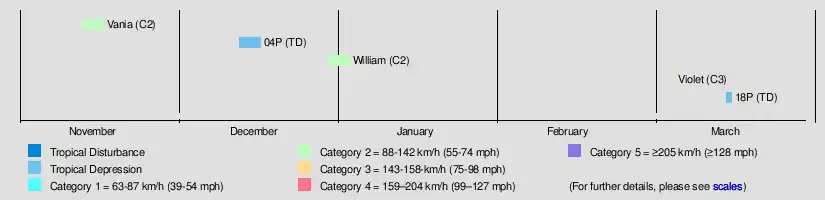 | Vania | November 12 – 18 | Category 2 tropical cyclone | 100 km/h (65 mph) | 980 hPa (28.94 inHg) | Solomon Islands, Vanuatu, New Caledonia, Fiji | Unknown | Unknown | [4] |