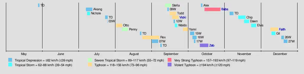 The 1998 Pacific typhoon season was the least active Pacific typhoon season on record, until it was surpassed 12 years later. It was also the third-latest starting Pacific typhoon season on record. The season produced 16 tropical storms, 8 strengthening into typhoons.[1] The scope of this article is limited to the Pacific Ocean, north of the equator and west of the International Date Line. Storms that form east of the date line and north of the equator are called hurricanes; see 1998 Pacific hurricane season. Tropical Storms formed in the entire west Pacific basin were assigned a name by the Joint Typhoon Warning Center. Tropical depressions in this basin have the "W" suffix added to their number. Tropical depressions that enter or form in the Philippine area of responsibility are assigned a name by the Philippine Atmospheric, Geophysical and Astronomical Services Administration or PAGASA. This can often result in the same storm having two names.