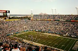Pro Football Reference ,[ 2] however, argues that the 1999 Jaguars had the fifth-easiest schedule of any NFL team between 1971 and 2017.[ note 1] Both regular season losses were to the Tennessee Titans , and they lost again to Tennessee in the AFC Championship Game, making the Titans the only team to beat them the entire season; Jacksonville would not reach the AFC Championship again until 2017. The only other occasion the Jaguars opposed a team with a winning record was their 62–7 demolition of the Miami Dolphins in the divisional playoff. Most significantly, Jacksonville missed Super Bowl champion St. Louis , despite defeating the other four teams then comprising the NFC West – including a 41–3 destruction of the San Francisco 49ers on opening day – while their non-division conference opponents were Broncos and Jets squads weakened by injuries to Terrell Davis and Vinny Testaverde .[ 3]