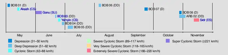 2007 was an active year for this basin; it was the most destructive season in known history at this time, only for the 2008 season to surpass it the next year. 2007 was also the first season to have multiple Category 5 cyclones (by the Saffir Simpson Scale), and the two Category 5's, Sidr and Gonu, were also the first named Category 5 cyclones to form in their respective seas; Gonu in the Arabian Sea, and Sidr in the Bay of Bengal. Some other notable storms of the season include Akash and Yemyin, both of which caused substantial damage and deaths. At least 4,545 deaths were reported, and damage was about 6.4 billion dollars.
