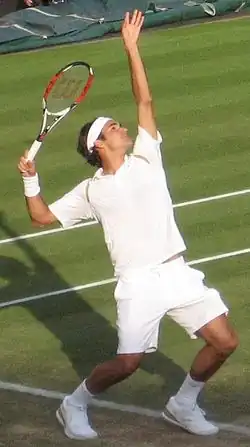Federer serving during the 2007 Wimbledon Championships, where he won his record fifth consecutive title.