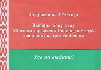 2. ^ a b c "Выборы в местные Советы депутатов Республики Беларусь двадцать шестого созыва (In Russian – 26th convocation local councils of Republic of Belarus elections)". belta.by. Archived from the original on 21 April 2010.
