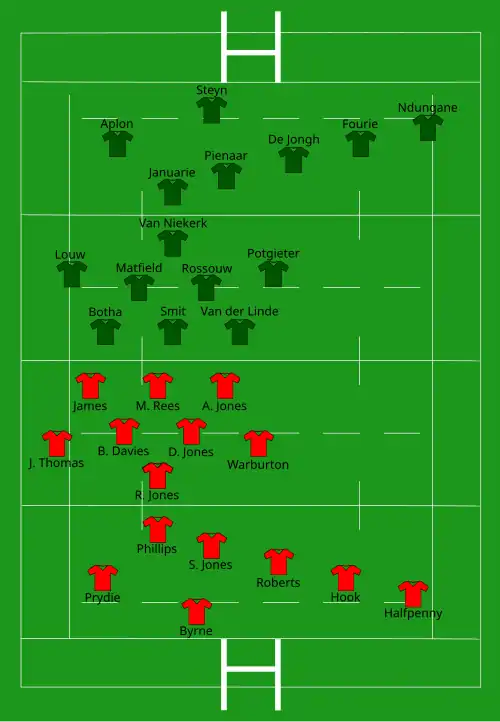 | Try: Hook 20' c Prydie 72' m A. W. Jones 77' c Con: S. Jones (2) 21', 77' Pen: S. Jones (3) 8', 18', 45' Drop: Hook 11' | Report | Try: Ndungane 30' m Potgieter 42' c De Jongh 59' c Con: Pienaar (2) 43', 59' Pen: Pienaar (4) 16', 23', 35', 74' Steyn 55' |