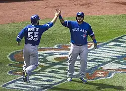 Russell Martin and Dioner Navarro on April 12. The signing of Martin moved Navarro into the backup catcher role. Navarro requested a trade but was not dealt before the start of the season.[35]