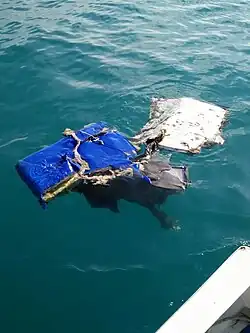 Immediately after the crash, debris began to float to the surface. At 12:30 local time, fishermen from Kijang recovered a blue piece of debris suspected from the aircraft. They also recovered several seats and personal belongings. Body parts were also found.[7] The fishermen stated that they found the debris around 40 nautical miles (46 mi; 74 km) from Kijang, the seat capital of Tanjung Pinang.[8]