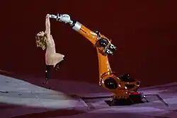 A segment called "Beyond Vision"[16] by computation artist and designer Marcelo Coelho, with projections by Muti Randolph, featured dancers dressed in black while carrying white light sticks, followed by a routine by a pair of partially-sighted dancers aided by a tactile floor.[7][8] This was followed by segments paying tribute to the sports that would be featured during the Games.[7] The Paralympic emblem was formed on the arena floor, followed by the entry and raising of the Paralympic flag; the flag was brought in by members of the Associação de Assistência à Criança Deficiente (an organization for disabled youth), and a montage of Paralympic athletes was played while the flag was raised. Following the taking of oaths, dancer and Paralympic snowboarder Amy Purdy, dressed in a 3D Printed Dress designed by fashion designer Danit Peleg, performed a dance routine with a KUKA robotic arm, which symbolized the co-existence of humans and technology.[17][18][15]