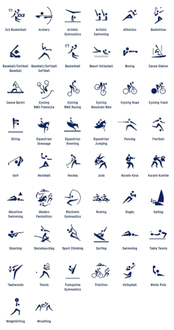 The Olympic Games Tokyo 2020 sport pictograms were released on 12 March 2019 (500 days to the originally scheduled opening ceremony), they are designed to subtly communicate the characteristics and athleticism of each sport, as well as artistically highlighting the dynamism of athletes.[1]