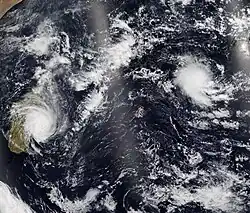 Multispectral animated satellite imagery revealed a 8 nautical miles (15 km; 9.2 mi) surrounded eye around deep convection as a result, the cyclone weakened to Category 2-equivalent cyclone.[45] Further weakening occurred as the MFR assessed that Darian's winds bottomed out at 155 km/h (100 mph).[46] At 03:00 UTC on 26 December, the JTWC reported that Darian had re-strengthened to 205 km/h (125 mph) with a warm 14 °F (−10 °C), a wide eye 25 nautical miles (46 km; 29 mi), and was surrounded by cold, −98 to −116 °F (−72 to −82 °C) cloud tops.[47] Using the Dvorak technique, MFR estimated winds of 185 km/h (115 mph).[48][49] Due to moderate east-northeasterly vertical wind shear, Darian fell to 155 km/h (100 mph) winds, according to MFR.[50] Just six hours later, the eye feature persisted, consisting of a warm area within the cooling eyewall.[51] At 15:00 UTC on 27 December, the JTWC further downgraded it to a Category 1-equivalent cyclone.[52] Satellite imagery showed that the cloud pattern began to rapidly deteriorate, and MFR followed suit and declared it a severe tropical storm.[53] The JTWC also reported that Darian's weakened into a tropical storm.[54] By 00:00 UTC on 29 December, Darian weakened into a moderate tropical storm, after the convection diminished around the center.[55] MFR issued its last advisory on the storm on 30 December as it transitioned into a post-tropical depression.[56] The JTWC also discontinued warnings on the system around 03:00 UTC on 31 December.[57]