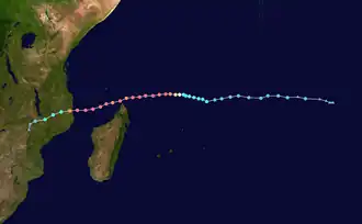 On 12 February, Tropical Cyclone Taliah crossed over from the Australian region at moderate tropical storm intensity, having formed there on 31 January. Almost immediately, Taliah reintensified into a tropical cyclone before weakening into a moderate tropical storm the next day while moving southwest.[80] Taliah then continued on its path while varying in intensity between moderate and strong tropical storm before becoming a post-tropical cyclone on 18 February near 31°S latitude over increasingly cooler waters and showing very sporadic storm activity far from the center. The RSMC La Réunion and the Joint Typhoon Warning Center then ceased their messages.[81][82]