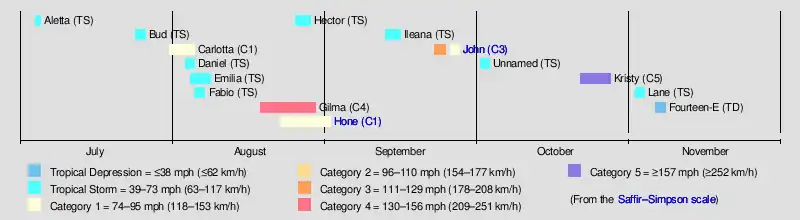 The 2024 Pacific hurricane season was a slightly below-average season that saw 15 tropical cyclones develop overall, of which 13 developed into named storms.[nb 1] Among them, 5 developed into hurricanes, of which 3 intensified into major hurricanes. The season officially began on May 15 in the eastern Pacific basin (east of 140°W) and on June 1 in the central Pacific (between 140°W and the International Date Line); both ended on November 30. These dates, adopted by convention, historically describe the period in each year when most subtropical or tropical cyclogenesis occurs in these regions of the Pacific Ocean.[1] For the third consecutive year, there were no pre-season tropical cyclones in either basin, and the season got off to the slowest start of any Pacific hurricane season on record in the satellite era, [2] with the first eastern Pacific tropical storm, Aletta, not forming until July 4. The first (and only) central Pacific tropical cyclone, Hurricane Hone, formed on August 22, becoming the first named storm to develop in the basin since 2019.[3] The final system of the season, Tropical Depression Fourteen‑E, dissipated on November 7.